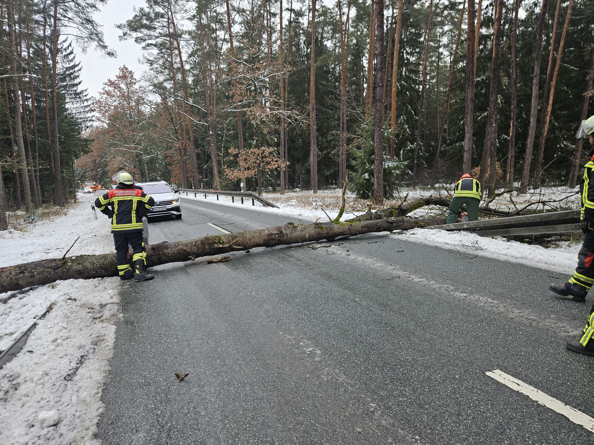 Den schweren Schneemassen hielt ein Baum auf der ST2220 Richtung Wassermungenau leider nicht stand und blockierte die Fahrbahn im Morgenverkehr. Mittels Kettensäge wurde der Baum schnell zusammengeschnitten und beseitigt. Nach ca. 15 Minuten konnten wir auch wieder in das Gerätehaus wieder einrücken.