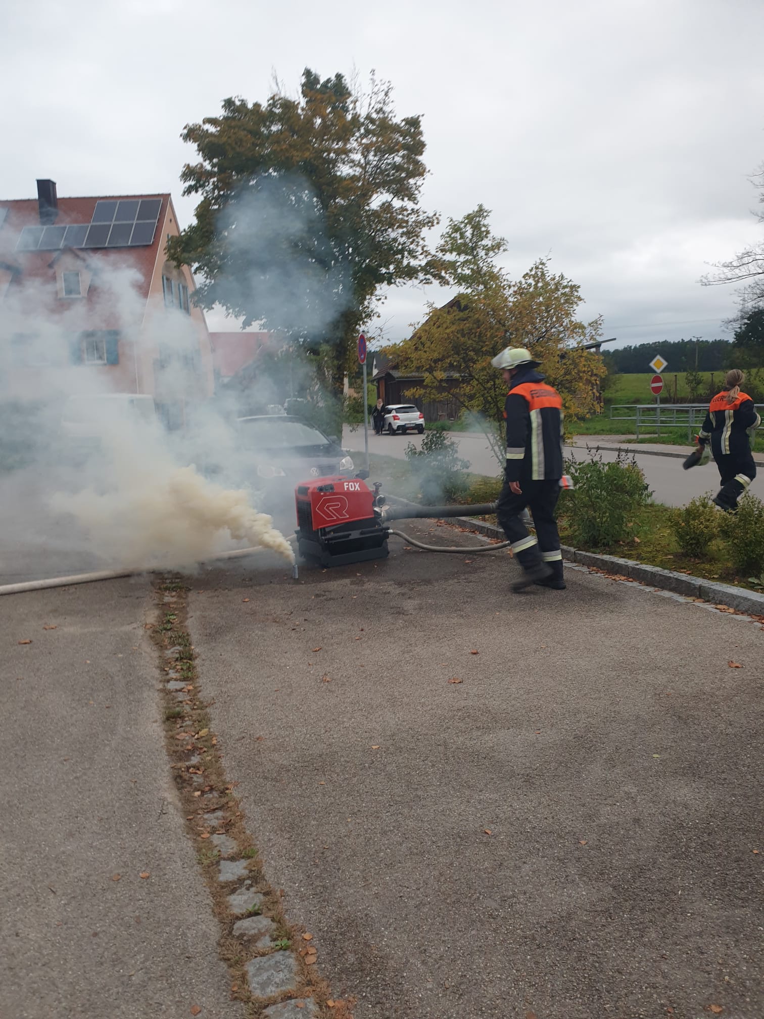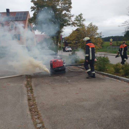 Gegen 18 Uhr wurden die Feuerwehrmänner und -frauen mittels Sirene zu einem gemeldeten Schreinereibrand alarmiert. An der Einsatzstelle angekommen, erwartete sie eine sehr realitätsnahe Übung eines brennenden Holzlagers. Zusätzlich wurde noch ein Kellerbrand und ein Brand des Spänelagers als weitere Einsatzabschnitte beübt. Durch Nebelmaschinen und einige Rauchbomben wurde die Rauchentwicklung und dadurch die Einschränkung der Sichtverhältnisse wie bei echten Einsätzen simuliert. Die zuerst eintreffenden Feuerwehren aus Beerbach und Wassermungenau stellten fest, dass sich noch eine Familie im brennenden Keller des Hauses befand. Sofort wurde ein Trupp unter schwerem Atemschutz der Feuerwehr Wassermungenau zur Personenrettung in den Keller entsandt. Dieser Trupp konnte die eingeschlossenen Personen schnell lokalisieren und ins Freie retten. Im Anschluss bekämpfte der Trupp noch das Feuer im Keller.