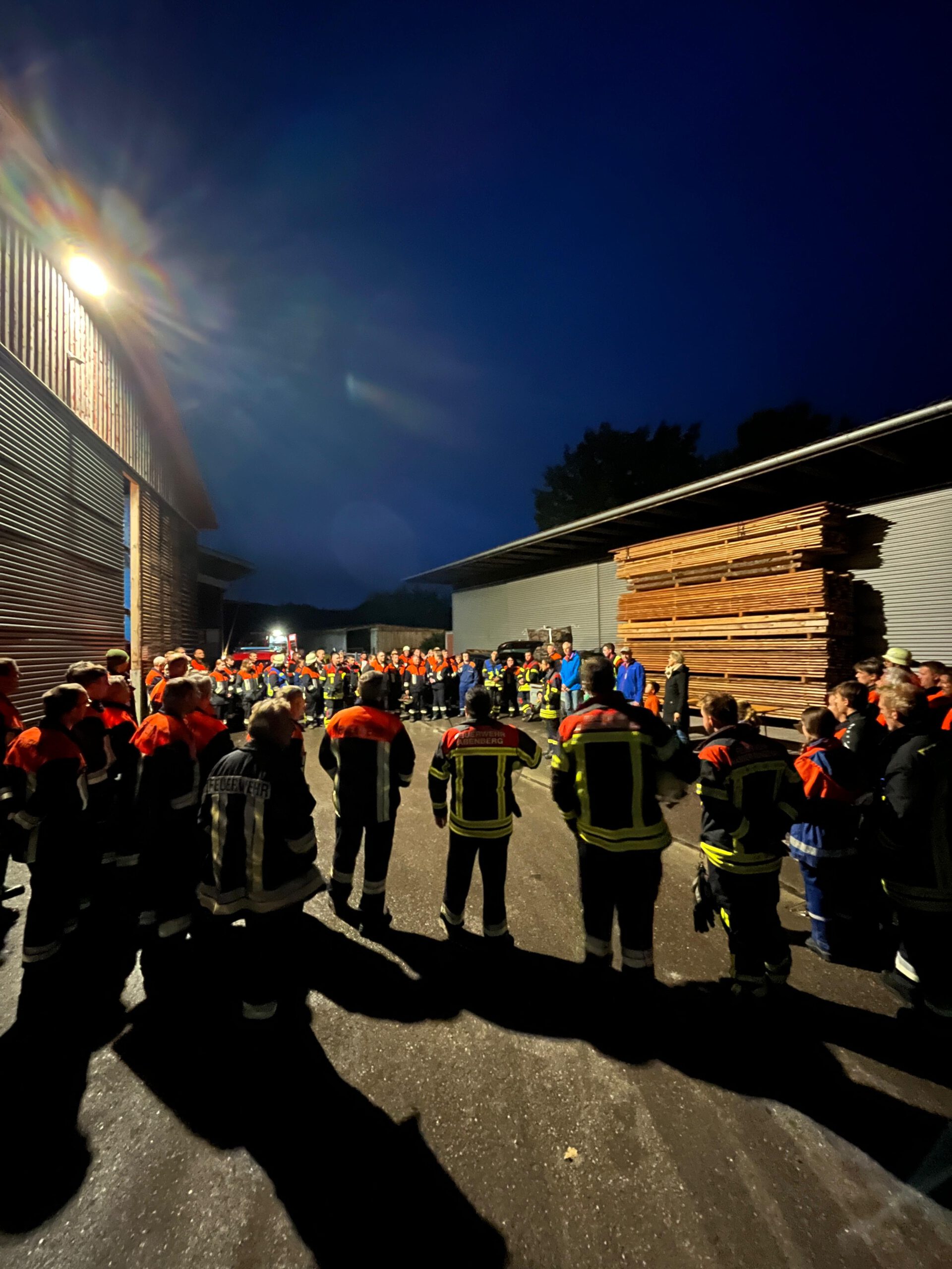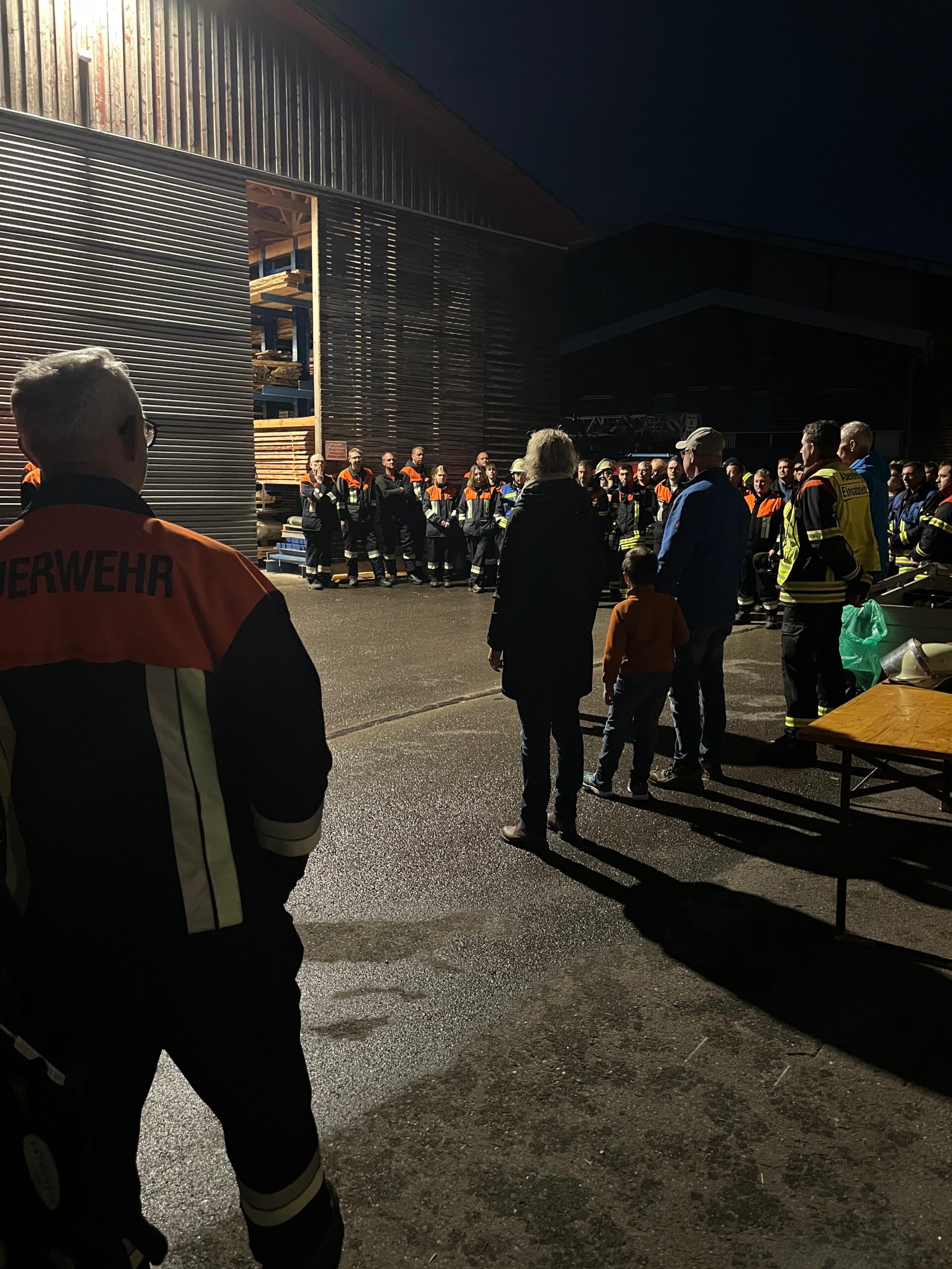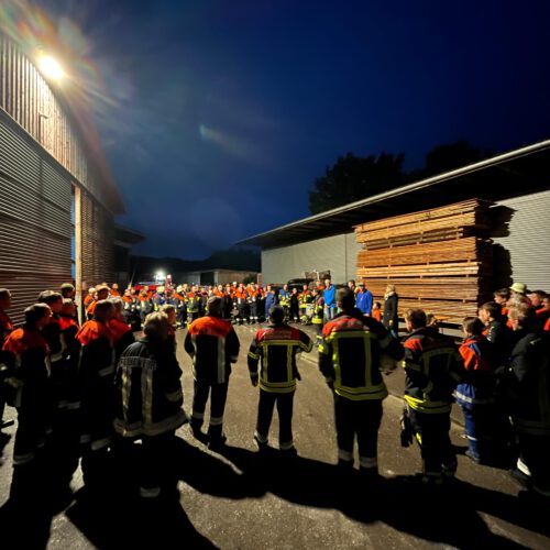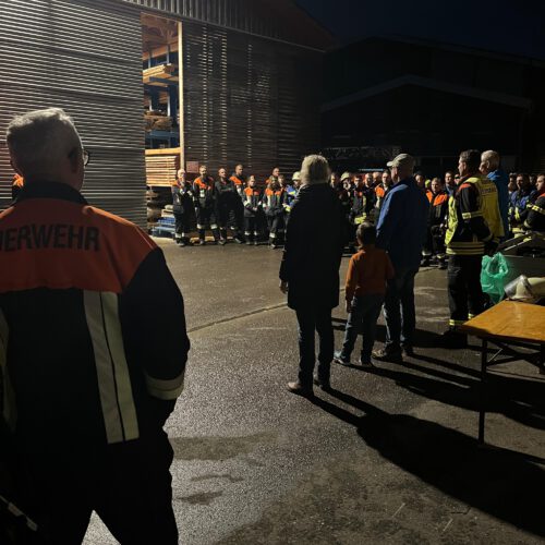 Nachdem alle Einsatzlagen erfolgreich abgearbeitet waren, kamen 100 Einsatzkräfte zur Übungsnachbesprechung zusammen. Einsatzleiter Manuel Burkhardt und der Kreisbrandmeister Jens Meyer erläuterten nochmals die gesamte Übungslage, da viele Beteiligte nur ihren eigenen Abschnitt mitbekommen hatten. Beide zeigten sich sehr zufrieden mit dem reibungslosen Ablauf. Auch Bürgermeisterin Susanne König lobte die gute Zusammenarbeit aller Ortsteile und zeigte sich erfreut über den Erfolg der Übung. Der Besitzer der Schreinerei, Thomas Walther, dankte den Wehren für das Üben an seinem Objekt und zeigte sich beeindruckt über den Ausbildungsstand der Feuerwehrfrauen und -männer.