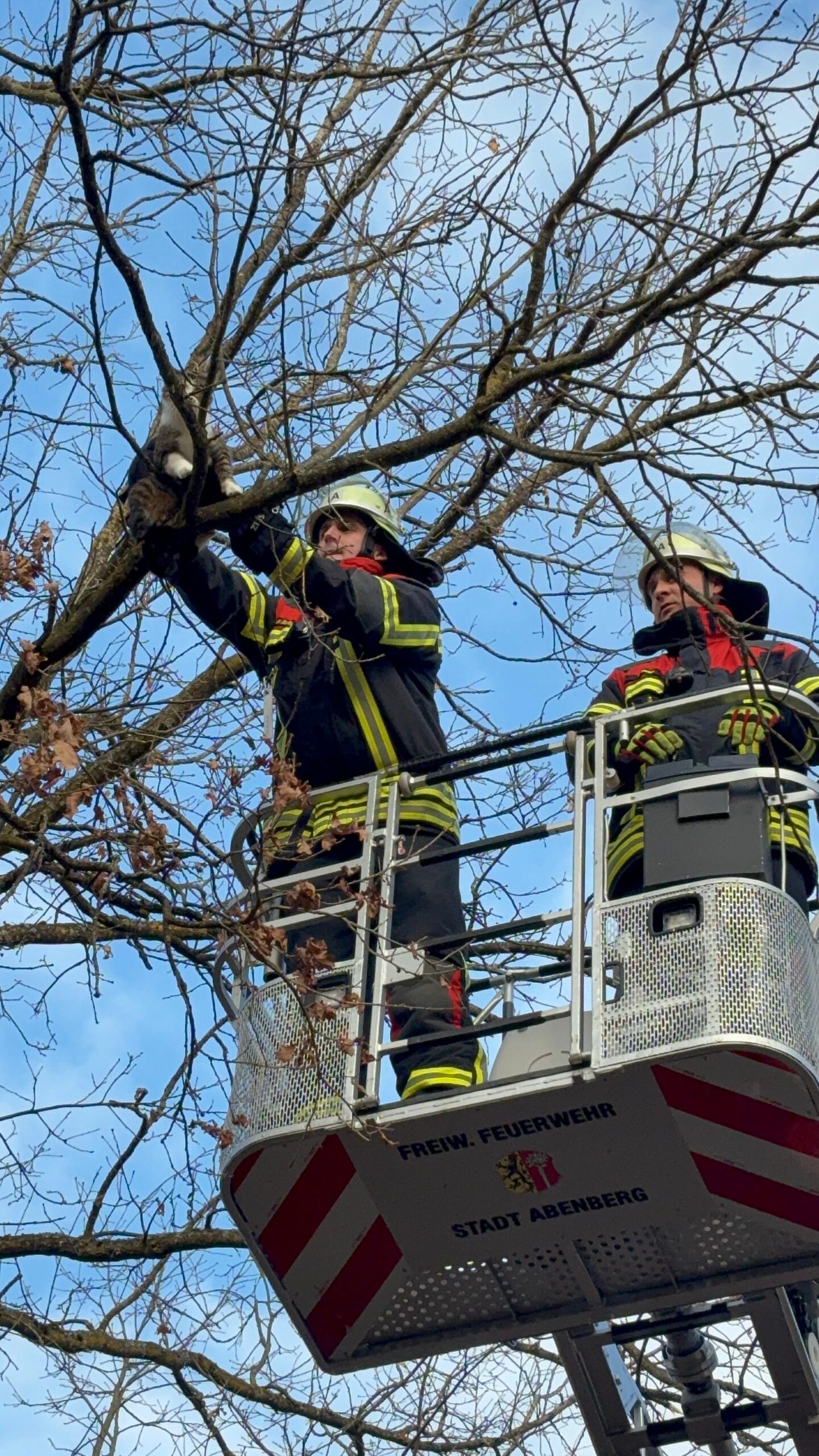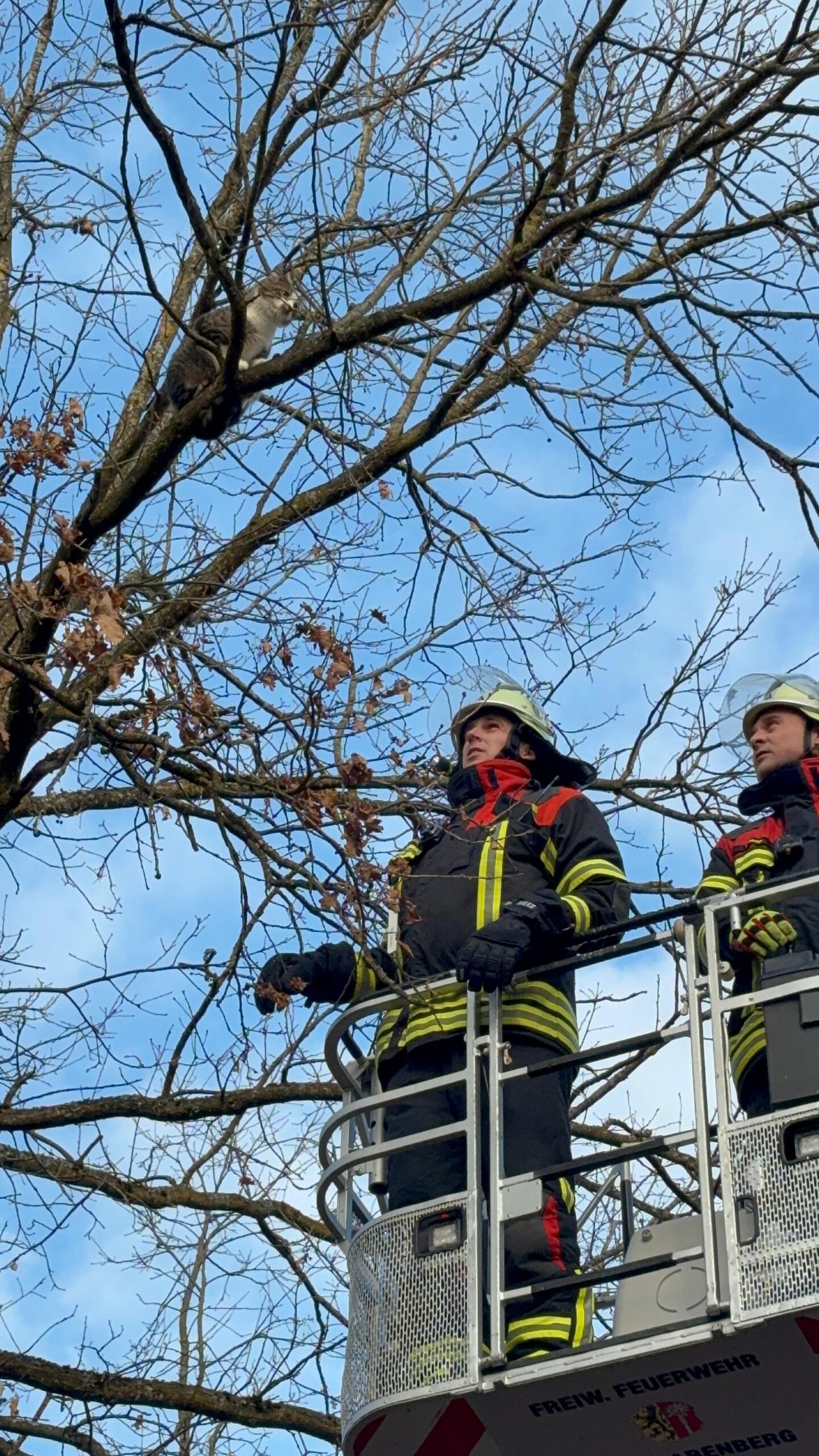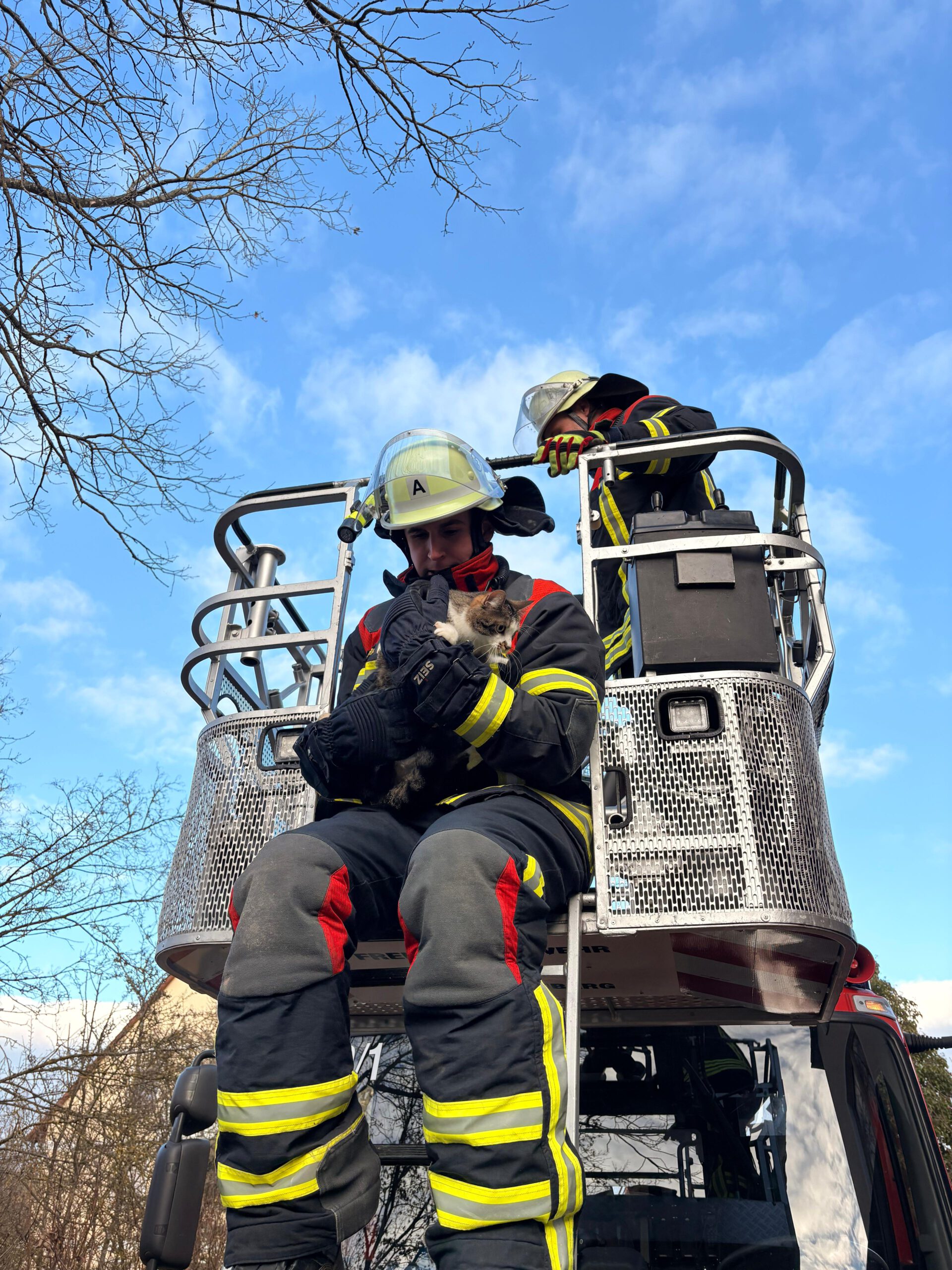 Retten, Löschen, Bergen und Schützen. Genau so lautet der Leitsatz der Feuerwehr. Heute wurden wir zu einem klassischen Rettungseinsatz nach Wassermungenau mit dem Stichwort 'Katze auf Baum' alarmiert. Bereits seit dem morgen saß 'Motschi' auf dem ca. 7m hohen Baum fest und kam nicht mehr herunter. Mit unserer Drehleiter wurde die kleine Katze aus ihrer misslichen Lage befreit und bedankte sich mit einem lautem 'Miau' bei den Einsatzkräften.